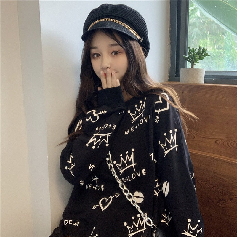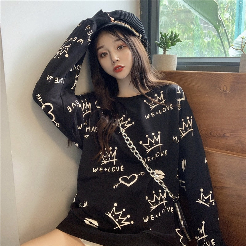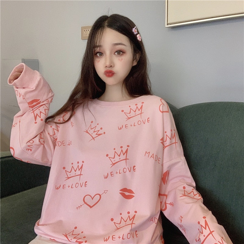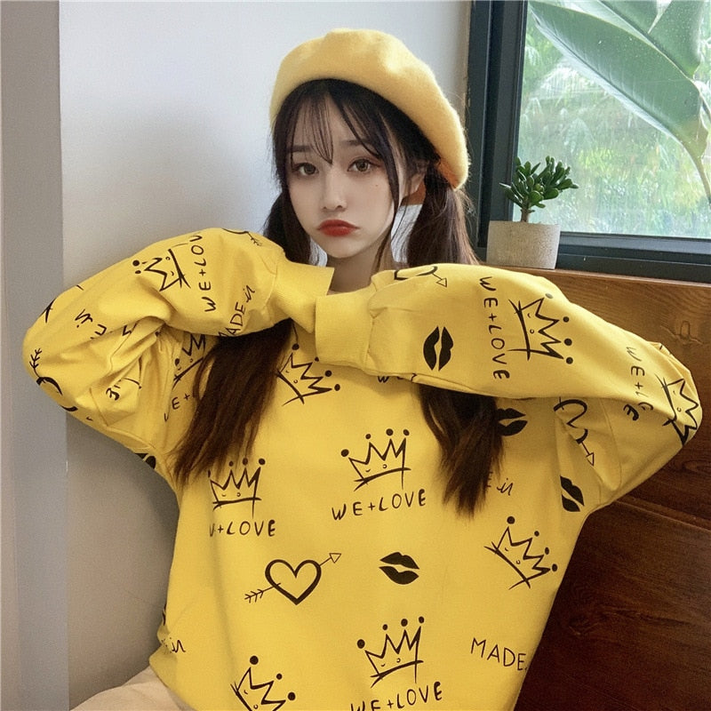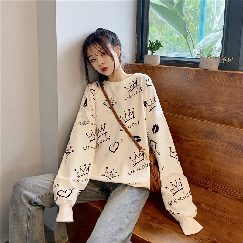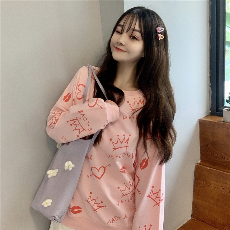 Vuoi essere una principessa della moda? Scopri la nostra Felpa con corona! Ha un look molto elegante con il suo motivo "we love". Un maglione morbido e confortevole che piace alle coreane.