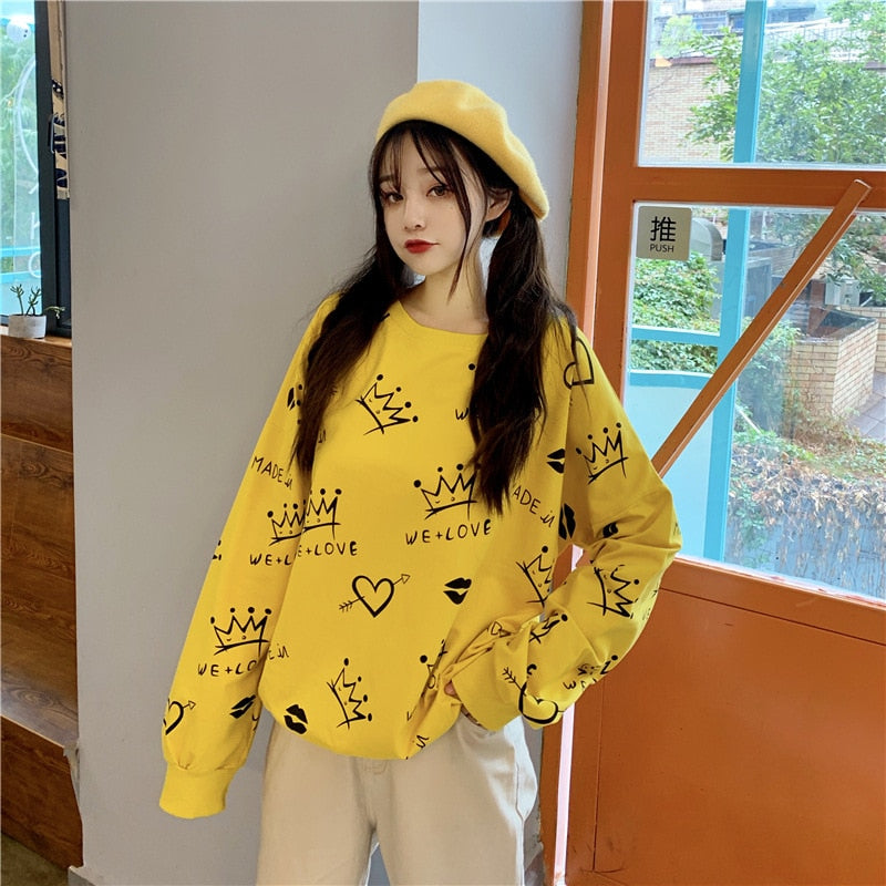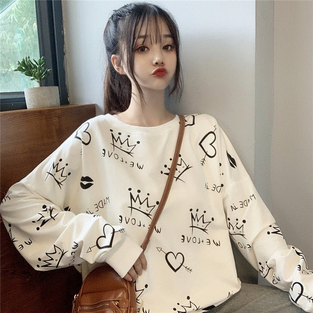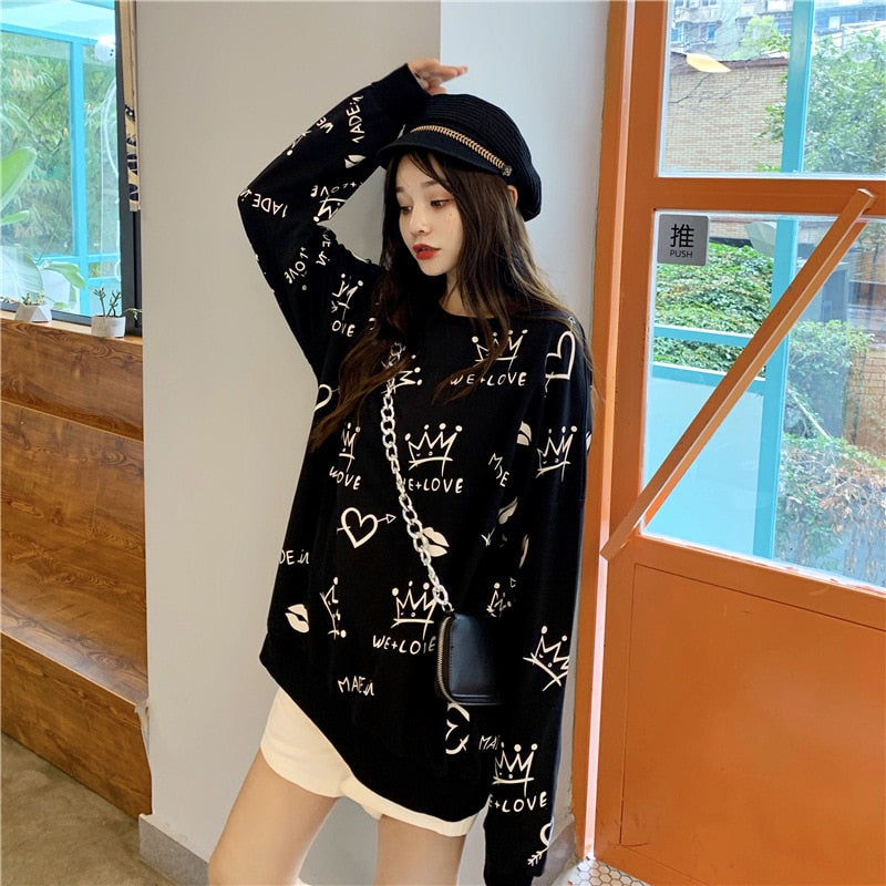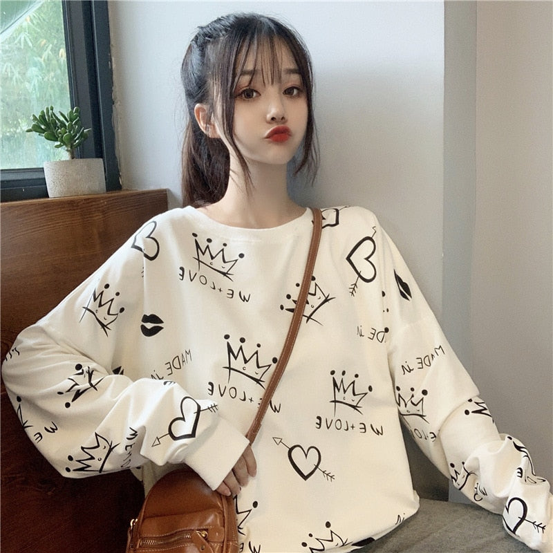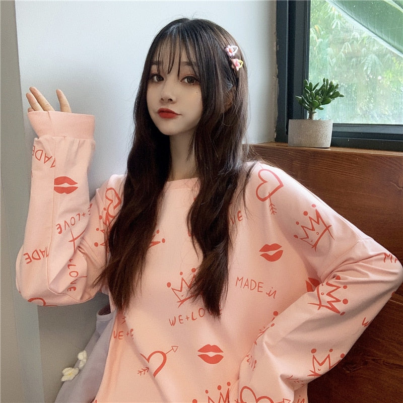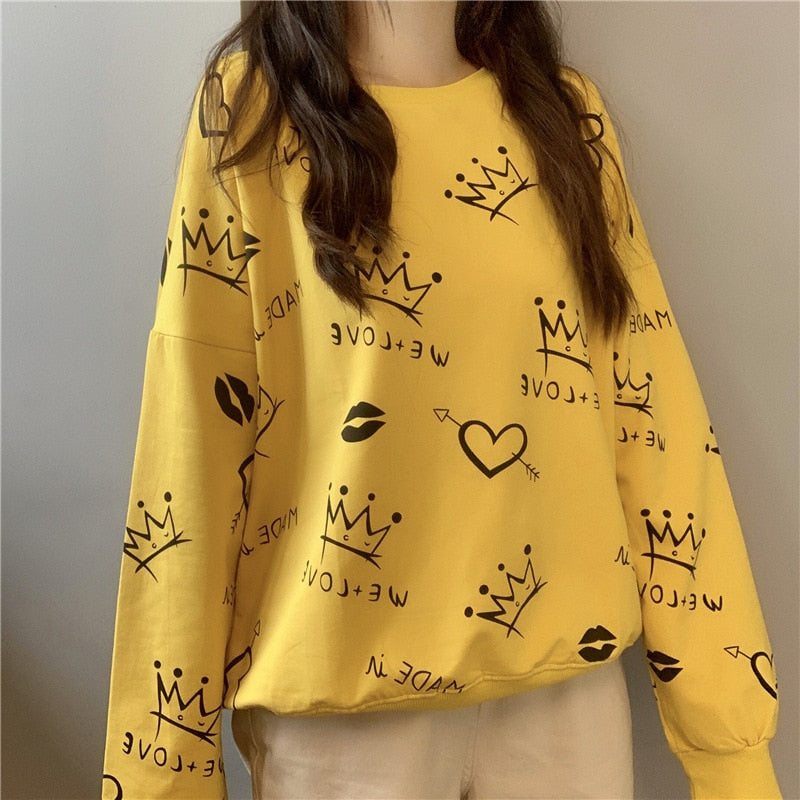 Vuoi essere una principessa della moda? Scopri la nostra Felpa con corona! Ha un look molto elegante con il suo motivo "we love". Un maglione morbido e confortevole che piace alle coreane.