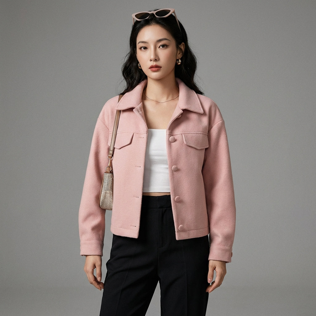 Questa giacca camicia corta rosa è un must-have per chi cerca un capo allo stesso tempo elegante e versatile, capace di adattarsi a tutte le occasioni, dal casual al più sofisticato.