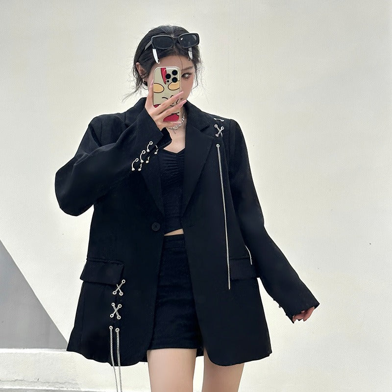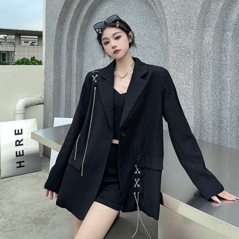 Scegliendo questa giacca cardigan a catena coreana, opti per un capo unico che arricchirà il tuo guardaroba con un tocco di sofisticata moda coreana.