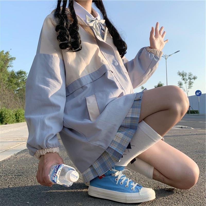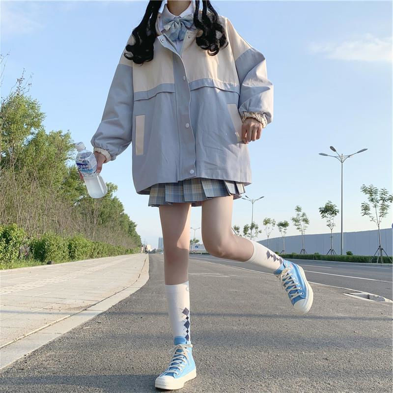 La giacca coreana blu per uscire senza temere la pioggia. È una bellissima giacca patchwork molto di tendenza a Seoul. Indossa questa giacca blu per distinguerti.
