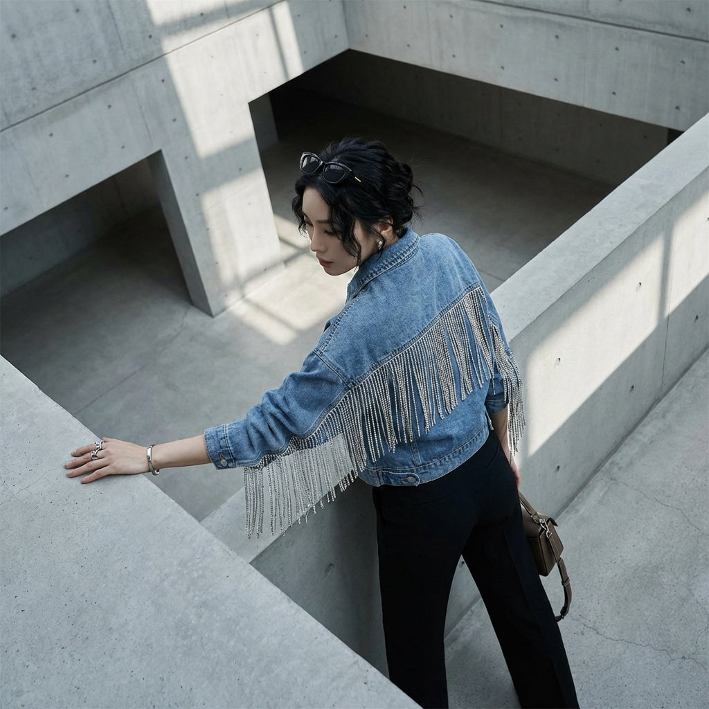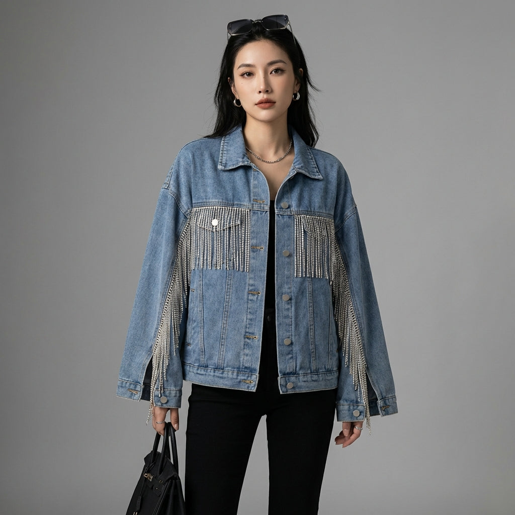 Afferma il tuo stile con la nostra giacca corta in denim, un capo audace e di tendenza. Progettata per chi ama distinguersi, combina il classico denim con dettagli di frange e catene, aggiungendo un tocco ribelle e sofisticato a tutti i tuoi outfit. Perfetta per un look streetwear o una serata tra amici! ✨