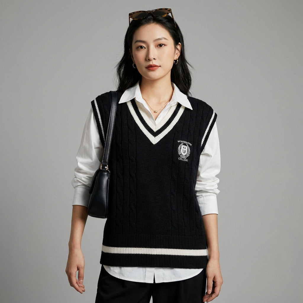 Adotta un look trendy e casual con il nostro gilet pullover senza maniche in stile universitario. Il suo design bicolore e il collo a V aggiungono un tocco moderno ai tuoi outfit autunnali e primaverili! 🍂