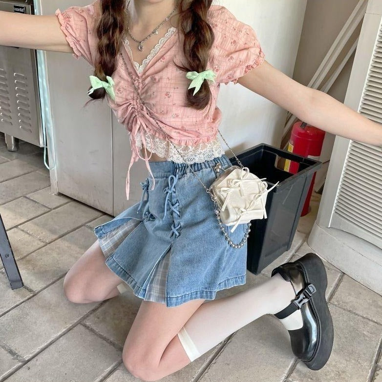 Hai bisogno di una gonna carina e alla moda? Vuoi una fantasia a quadri? Questa gonna di jeans è perfetta per te. Ha un tessuto a quadri e dei bei lacci. È una gonna coreana molto apprezzata dalle giovani donne.