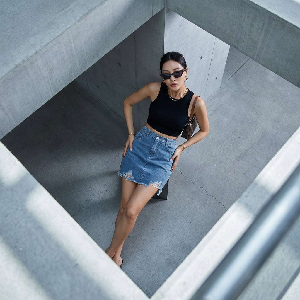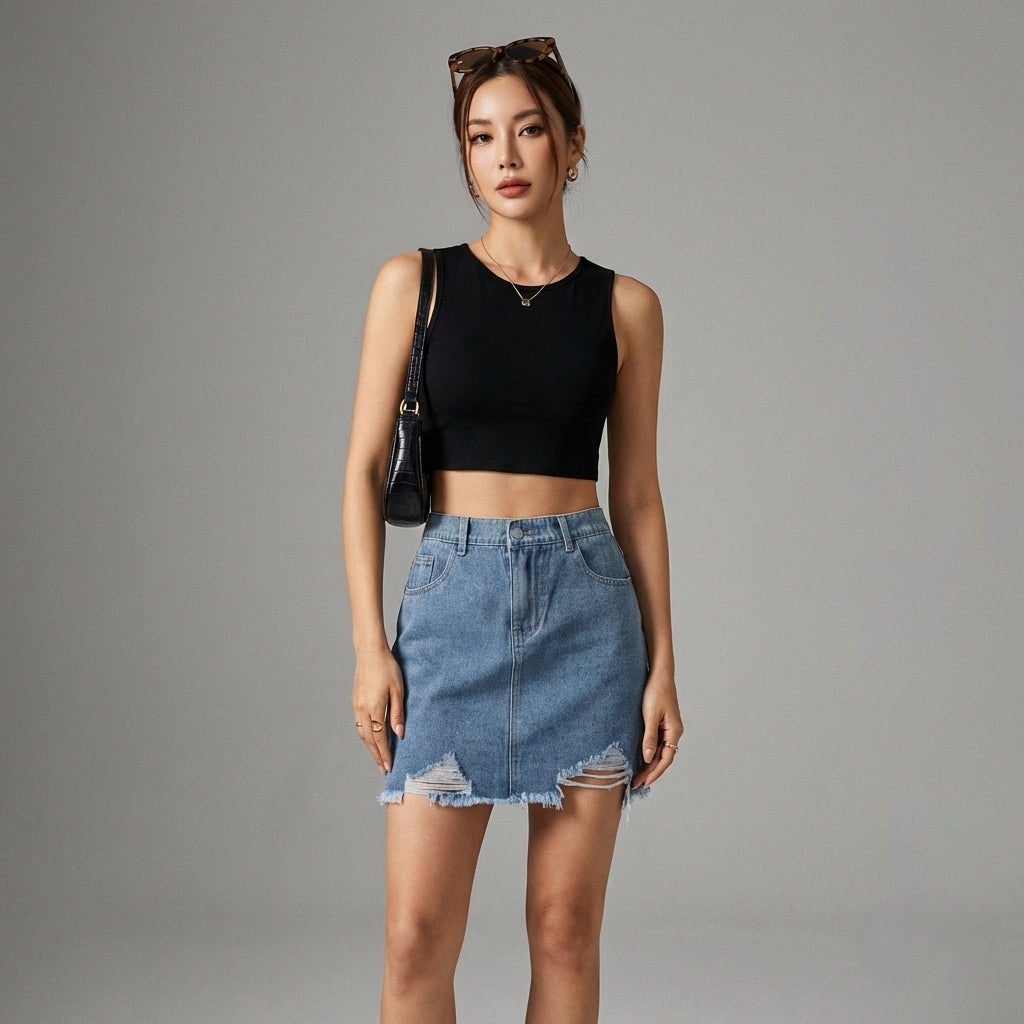 - Tipo: Minigonna, Sfrangiata. Un taglio moderno e dettagli grezzi per un look deciso.