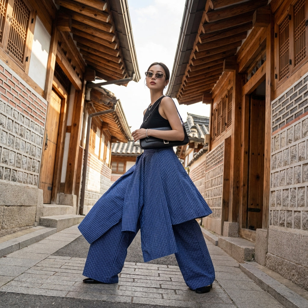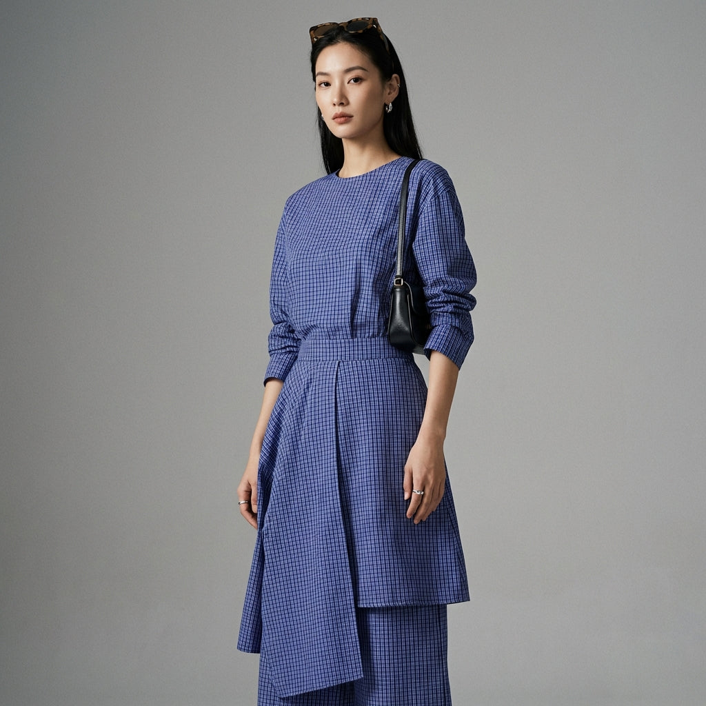 Afferma il tuo stile con la nostra gonna-pantalone asimmetrica a quadri blu, un capo unico che combina l'eleganza di una gonna e il comfort di un pantalone. Il suo taglio innovativo e il design a "falsa" gonna ti garantiscono un look moderno e raffinato! 💙