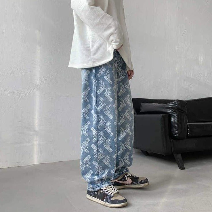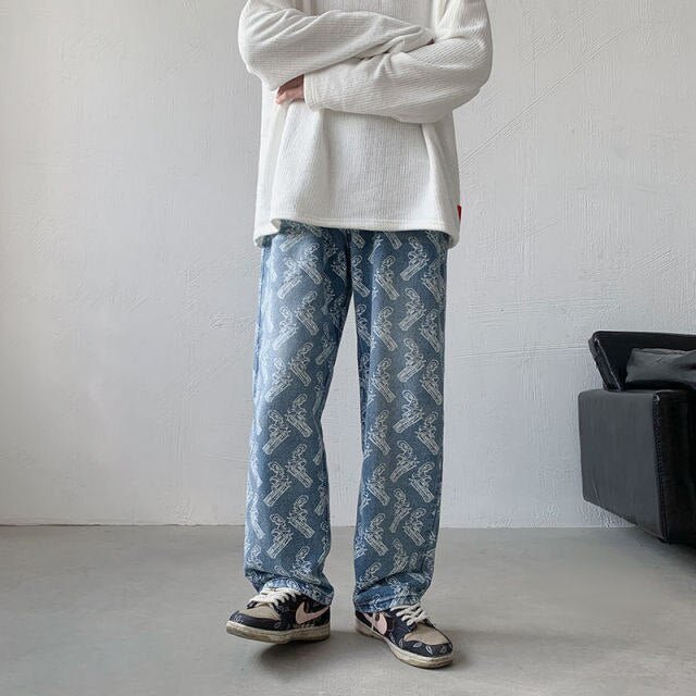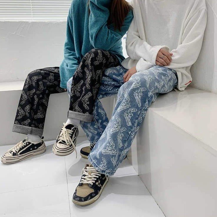 Questo jeans retrò rappresenta armi e un look all'antica. È un bel pantalone per i giovani che vogliono rompere gli schemi. Questo jeans è disponibile in nero e blu. Rappresenta bene la moda di strada e delle gang. È un capo popolare tra i giovani coreani.