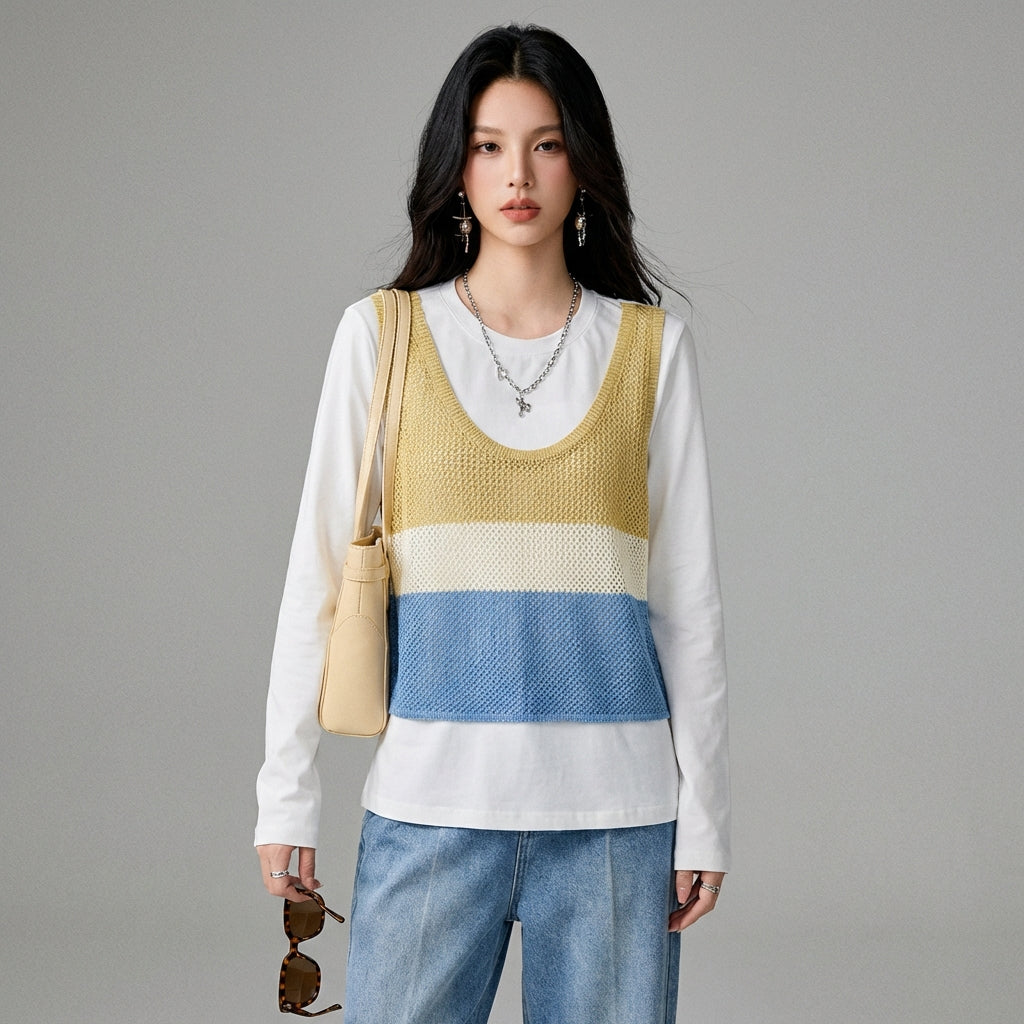 Adotta un look fresco e alla moda con il nostro top a maglia bicolore, caratterizzato da un girocollo e maniche lunghe. Il suo design unico simula un effetto "due pezzi" per un'allure moderna e sofisticata. Perfetto per aggiungere un tocco di originalità al tuo guardaroba casual! ✨
