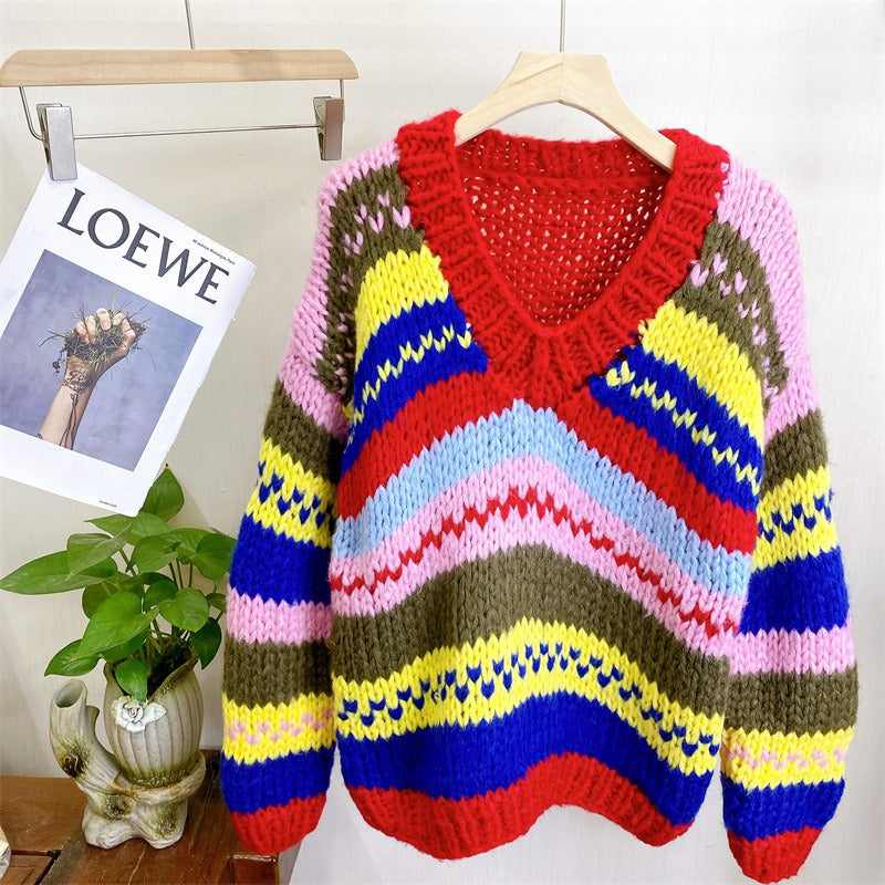 Adotta lo stile casual con il nostro maglione a righe spesso coreano a maniche lunghe. Questo maglione con scollo a V e motivo color block è perfetto per un look casual e confortevole! 🍂