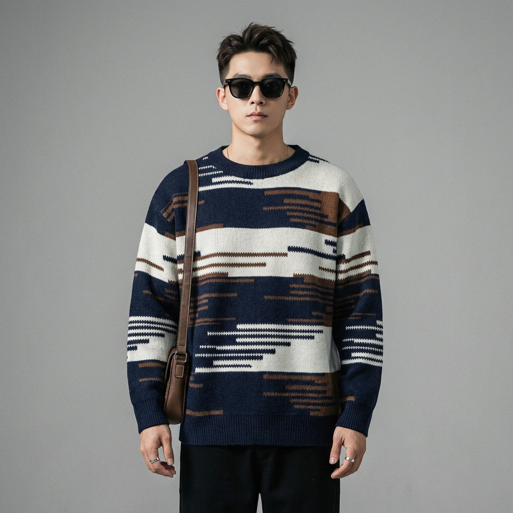 Adotta un look casual e alla moda con il nostro maglione jacquard a girocollo. Il suo design color-block e il taglio ampio lo rendono un capo ideale per le giornate fresche, unendo comfort e stile moderno! ✨