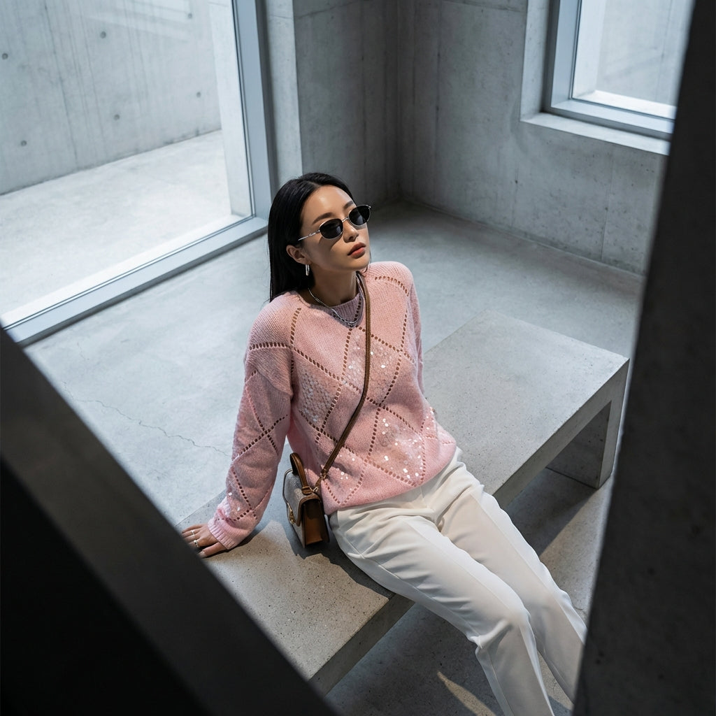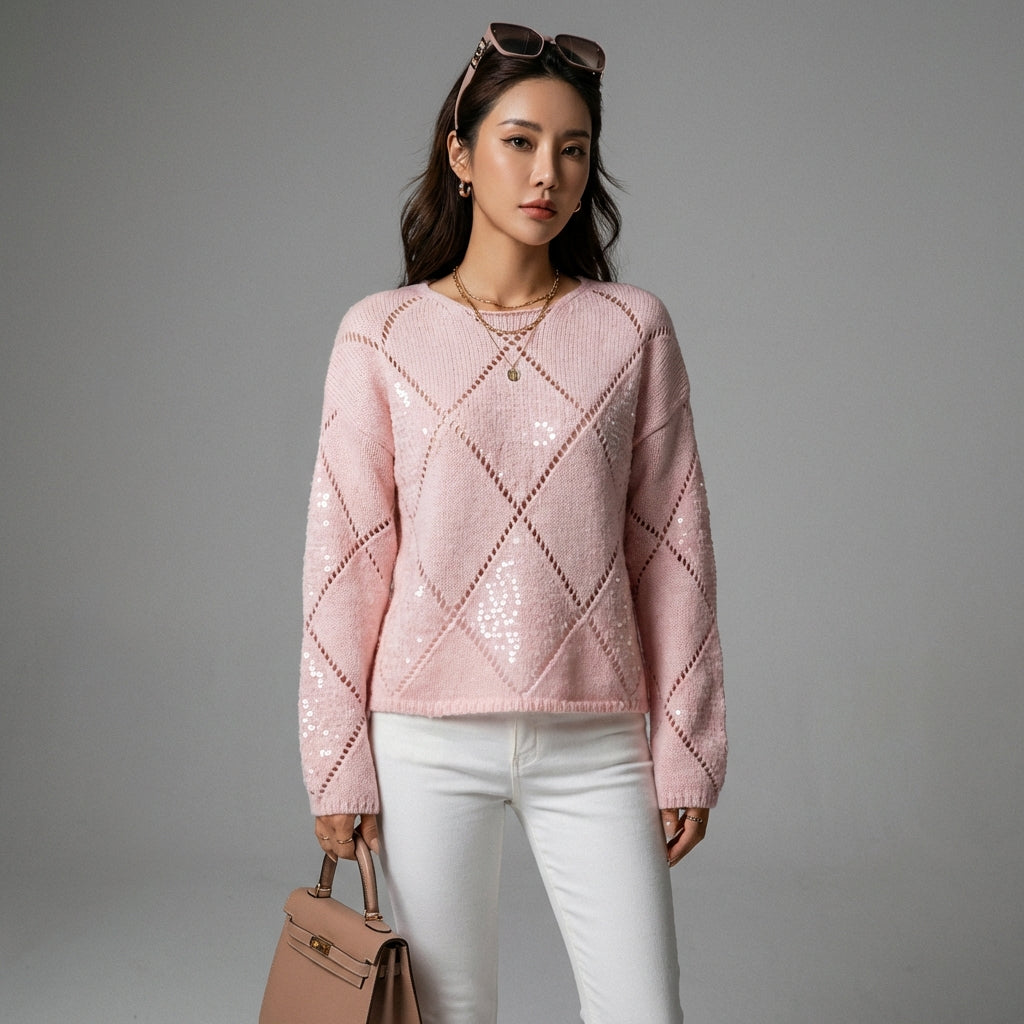 - Stile: K-fashion, Tendenza, Chic casual, Serata. Questo maglione incarna l'eleganza moderna della moda coreana con un tocco glamour, ideale per un look sofisticato o una serata.