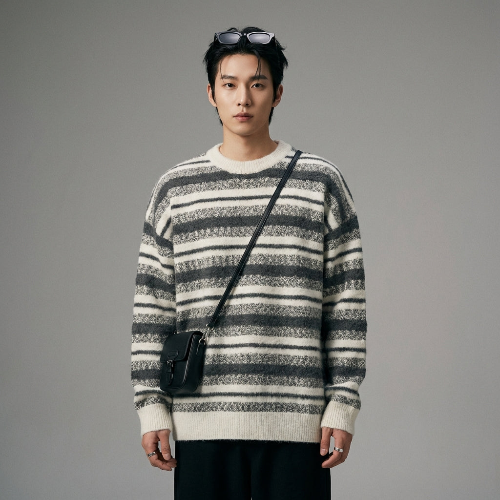 Questo maglione a righe è un must-have per chi cerca di combinare comfort, stile e le ultime tendenze della moda coreana.