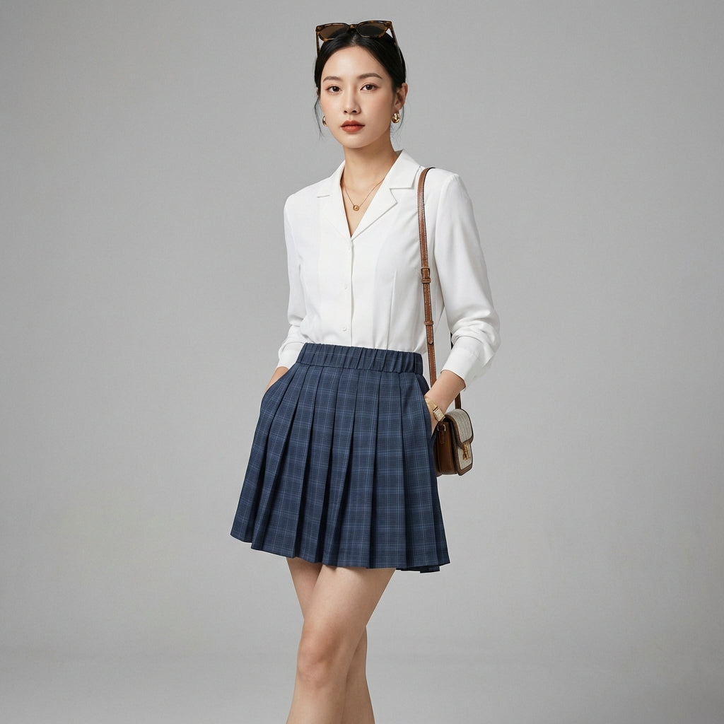 - Tipo: Minigonna, Plissettata, Vita alta. Un taglio corto e pieghe strutturate che allungano la silhouette e aggiungono movimento.