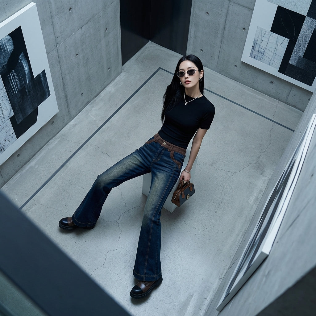 Questi pantaloni flare in denim bicolore sono un must-have per chi desidera esprimere la propria individualità e la propria passione per la moda coreana con audacia ed eleganza.