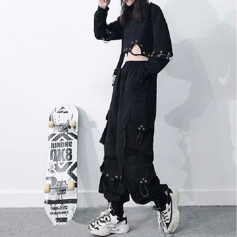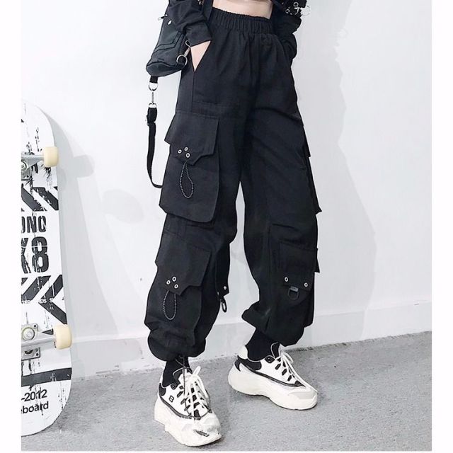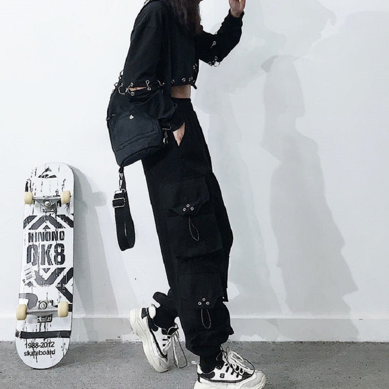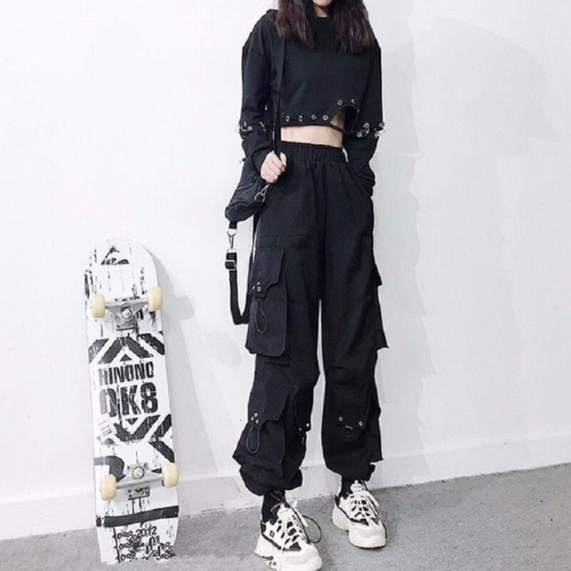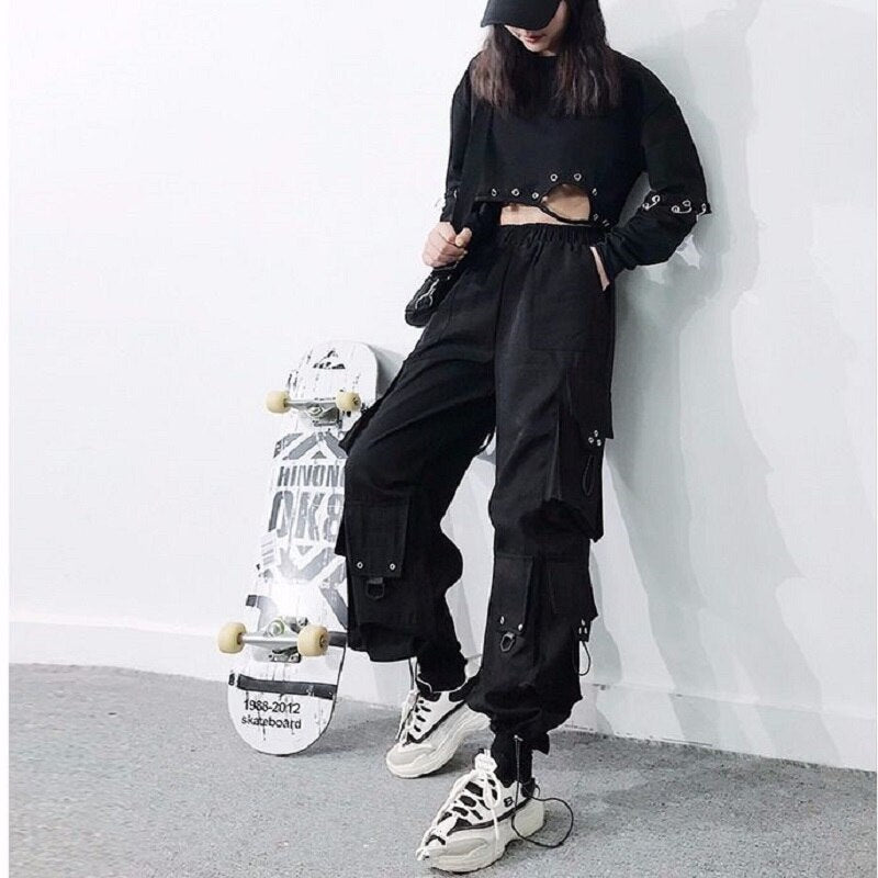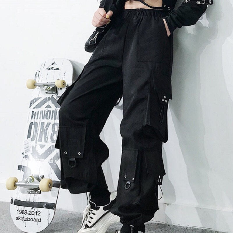 Ecco un pantalone cargo con uno stile completamente nero. Si abbina perfettamente a un outfit emo o gotico. È un pantalone streetwear perfetto per chi ama la moda coreana e il suo lato oscuro. Muoviti liberamente con questi pantaloni larghi emo.