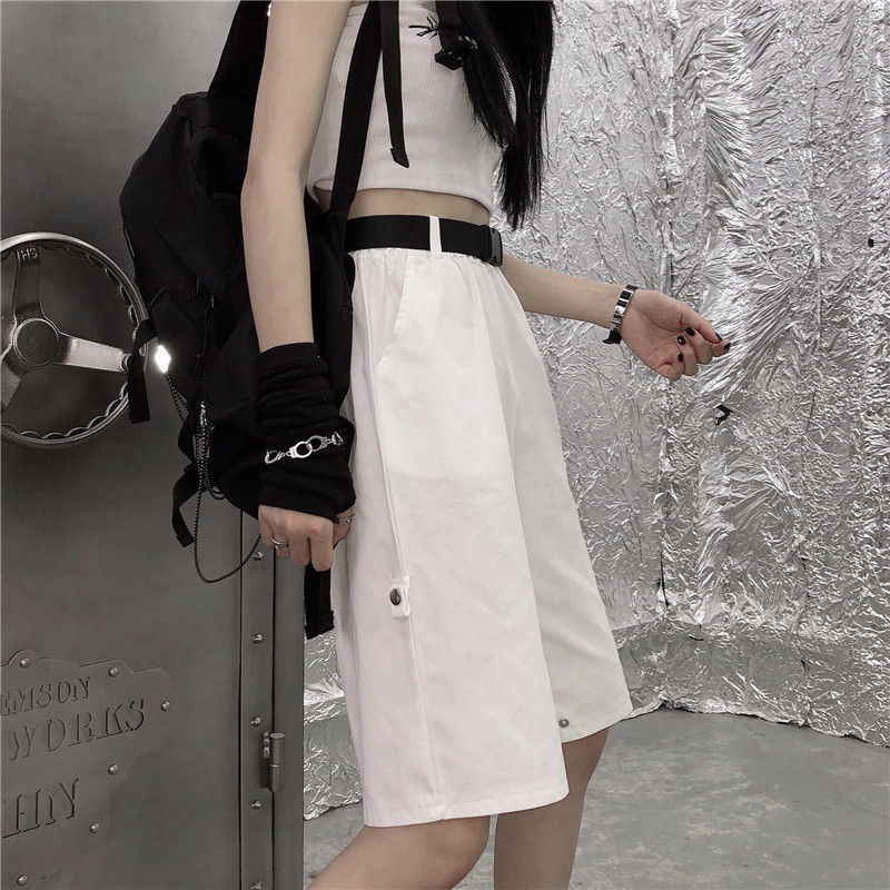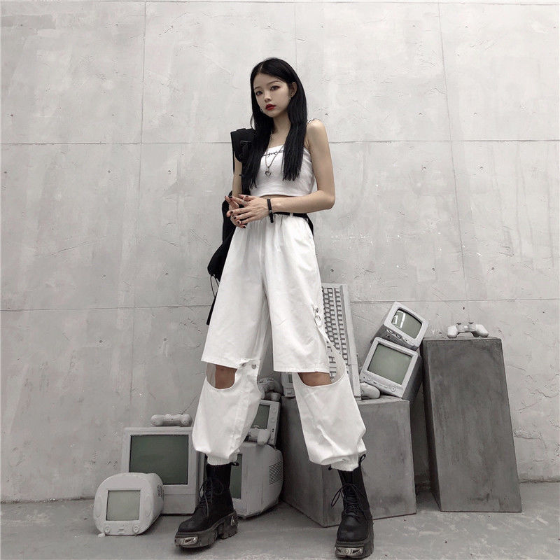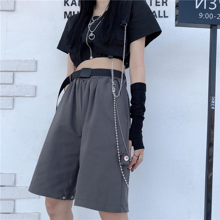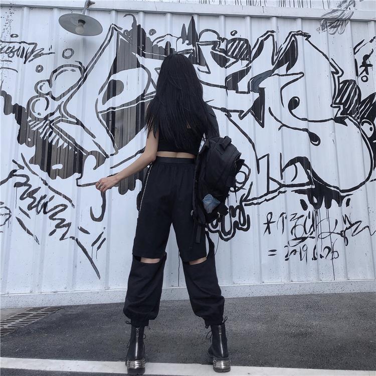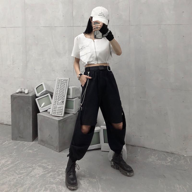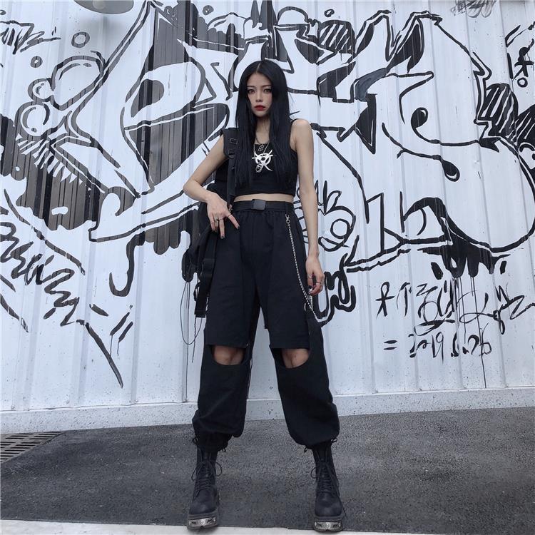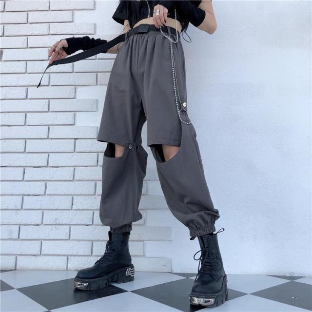 Ecco un pantalone punk che si trasforma in pantaloncino. Questo pantalone è diviso in due parti, è molto pratico se desideri un capo multifunzione con uno stile punk vicino allo streetwear coreano. È un pantalone aperto alle ginocchia che piace ai giovani ribelli.