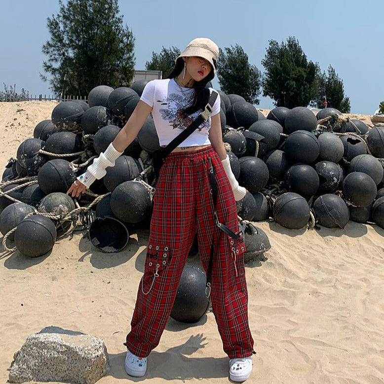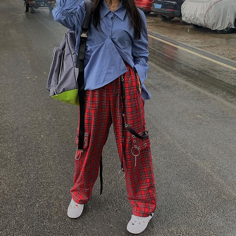 Cerchi dei pantaloni punk? Ti piacciono i quadri rossi? Ecco i pantaloni tartan che sono popolari in Corea del Sud. Sono pantaloni molto comodi da indossare e dotati di tasche. Sono perfetti per uno stile ribelle e deciso.