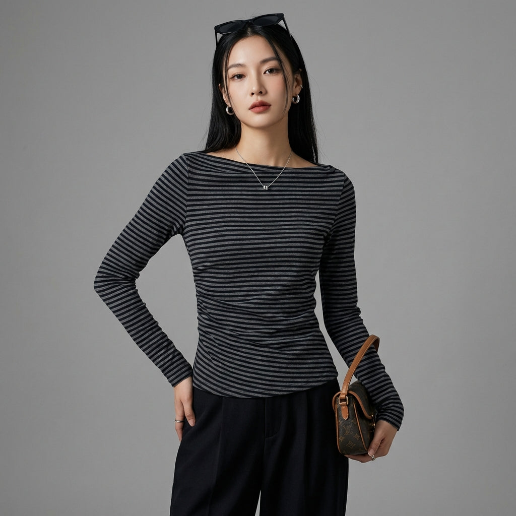 Adotta un look casual e chic con la nostra T-Shirt a maniche lunghe, dotata di scollo semi-aperto e di un intramontabile motivo a righe. La sua vestibilità aderente valorizzerà la tua silhouette per uno stile urbano e moderno! ✨