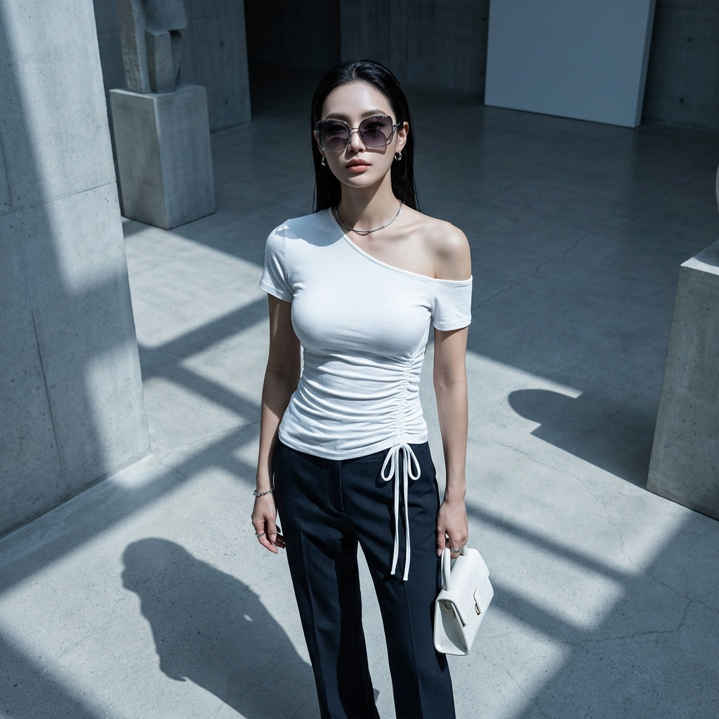 Afferma il tuo stile con la nostra t-shirt corta con spalla scoperta, perfetta per le giornate di sole. Il suo taglio slim e i dettagli a pieghe aggiungono un tocco di audacia al tuo guardaroba estivo, ideale per un look casual e alla moda! ☀️