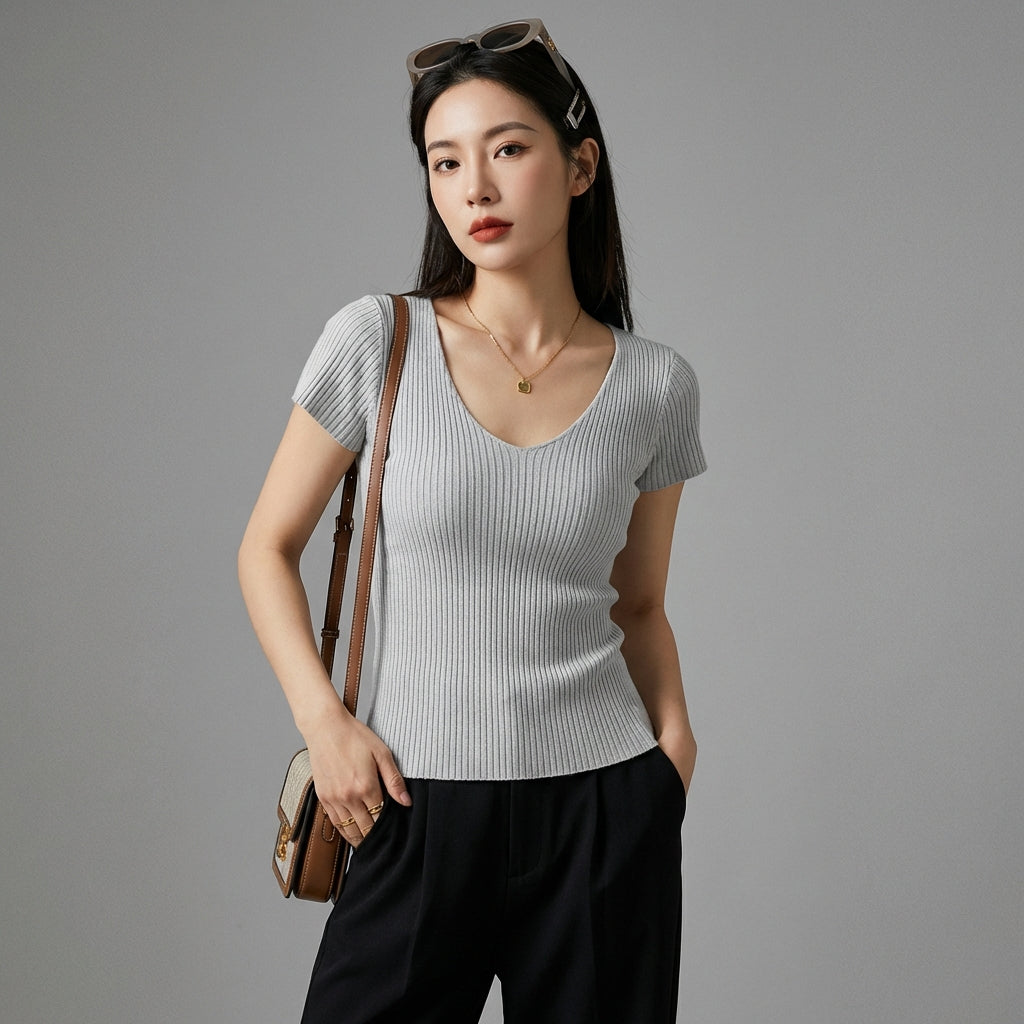 Adotta un look minimalista e di tendenza con questa T-shirt corta con scollo a V in maglia. Il suo taglio slim e il design pulito la rendono un capo indispensabile per una silhouette moderna ed elegante. Perfetta per le giornate di sole o per essere indossata a strati! ✨