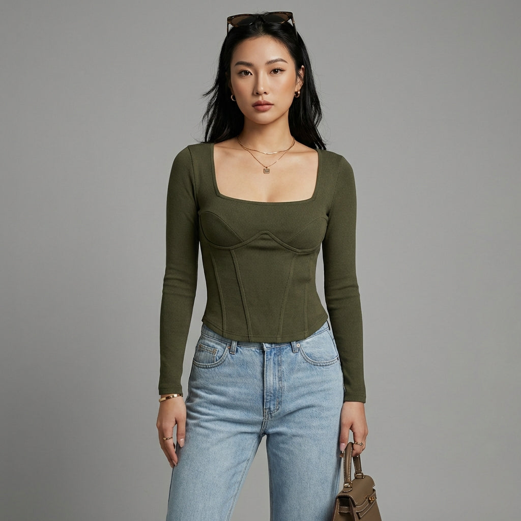 Adotta un look di tendenza e raffinato con la nostra T-shirt a maniche lunghe e scollo quadrato in maglia. La sua vestibilità aderente esalta la tua silhouette, ideale per tutte le occasioni casual o per un'elegante sovrapposizione! ✨