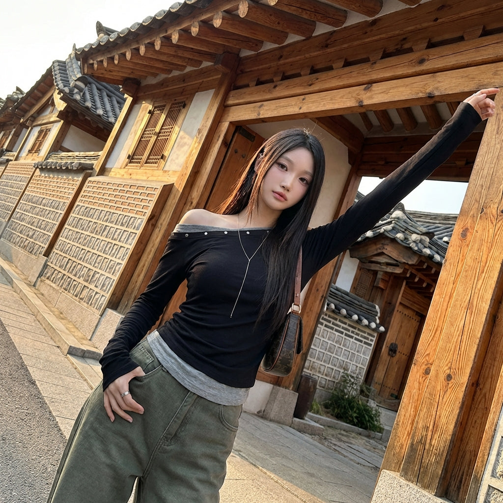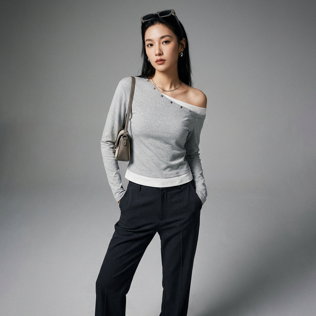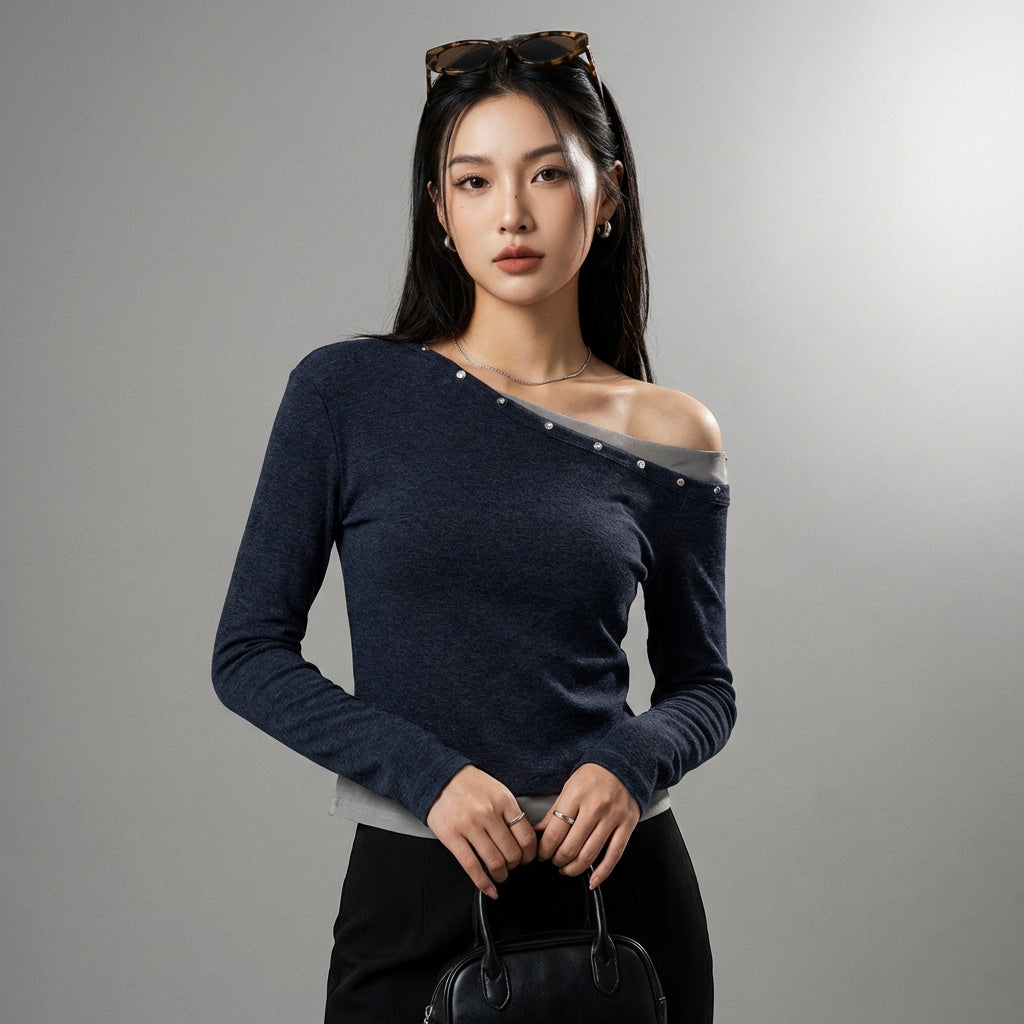 Scopri la nostra t-shirt bicolore a maniche lunghe, progettata per una silhouette elegante e moderna. Il suo design asimmetrico con spalla scoperta e i bottoni decorativi aggiungono un tocco di sofisticazione unico. Perfetta per un look chic e seducente! ✨