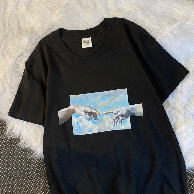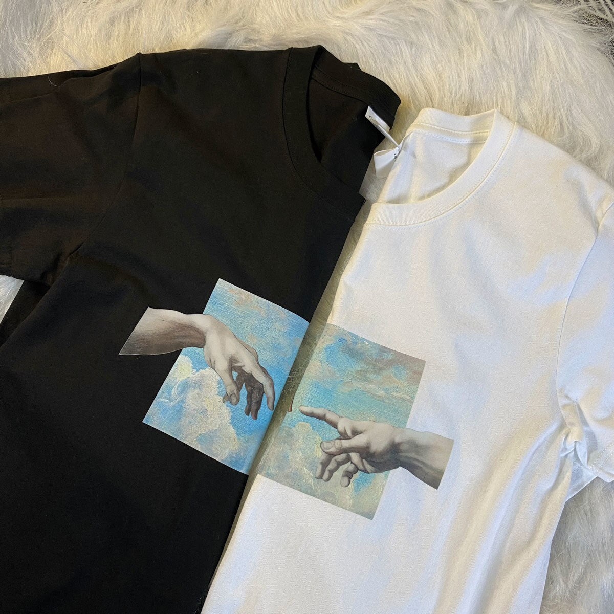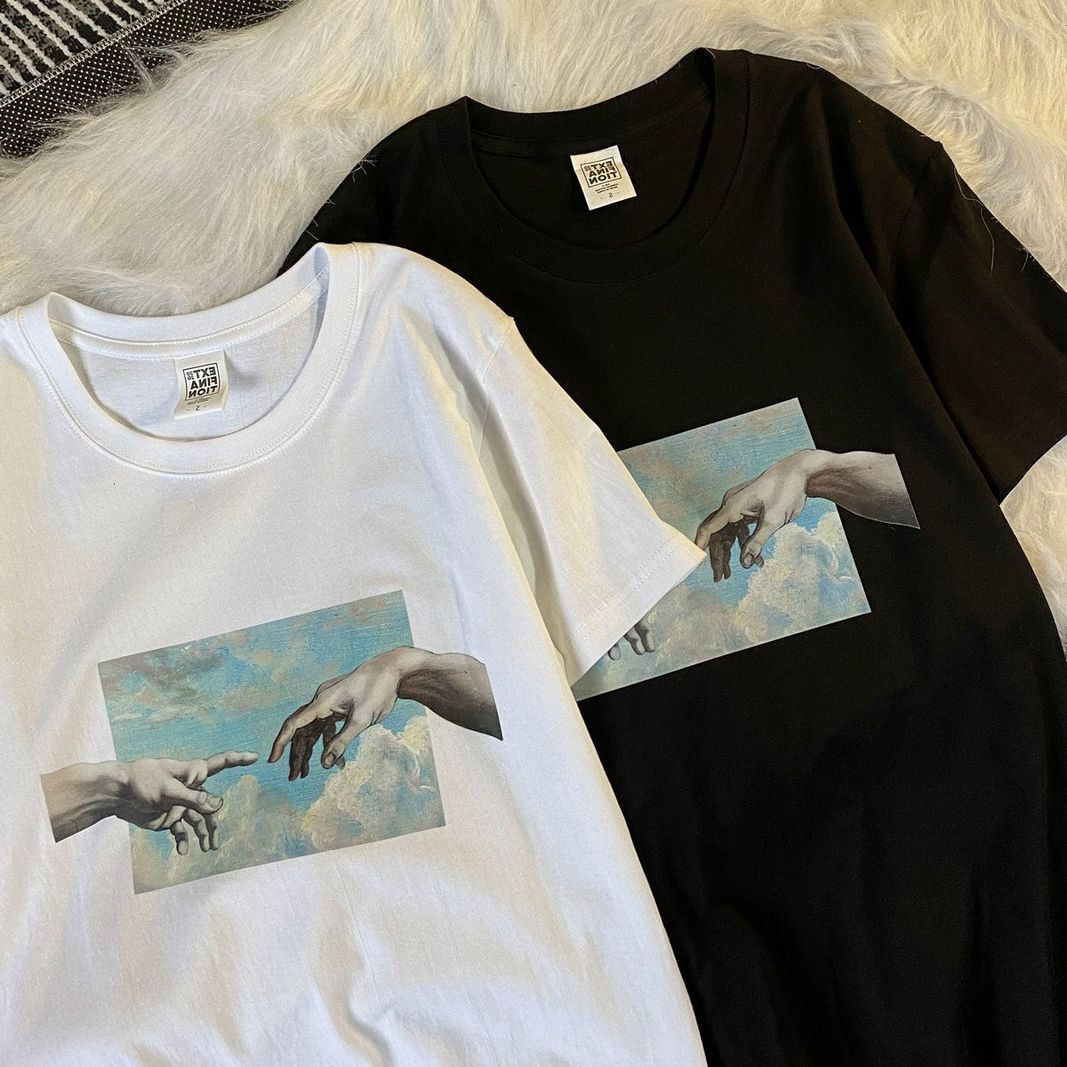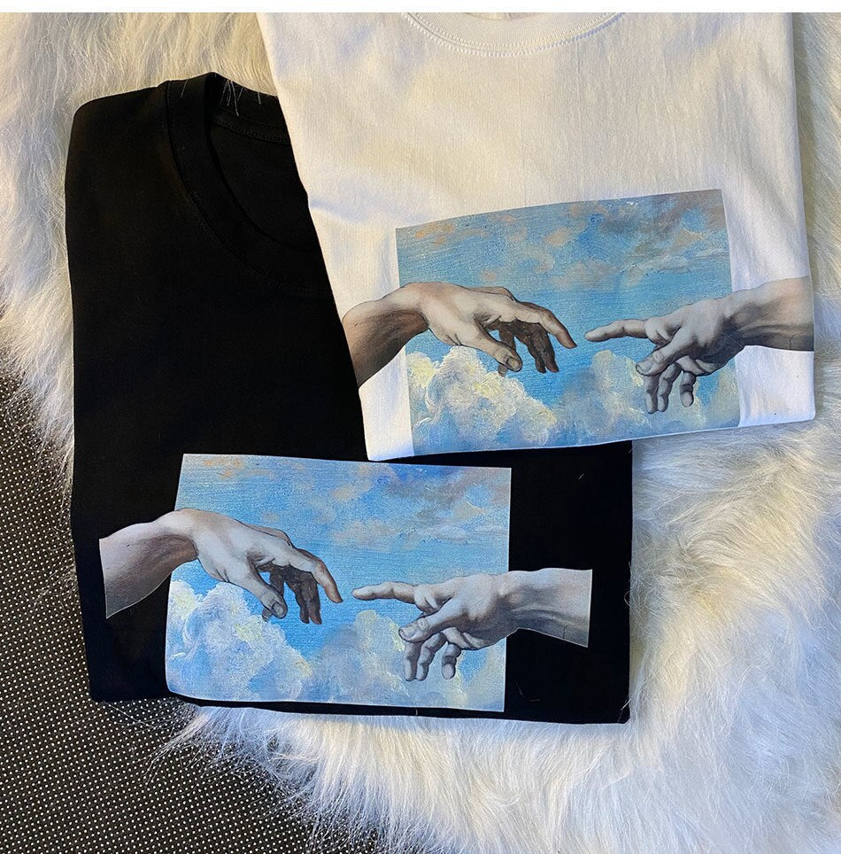 I coreani amano la cultura artistica europea. Questa T-shirt con le mani di Michelangelo è molto di tendenza tra i giovani coreani. La stampa è di buona qualità e la T-shirt ha un buon taglio classico. È ideale per gli appassionati di moda e della Corea del Sud.