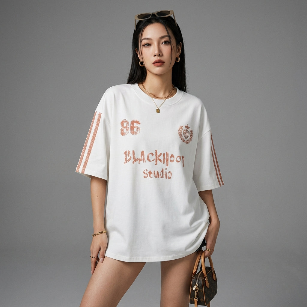Adotta un look casual e di tendenza con la nostra t-shirt oversize a girocollo, decorata con una stampa a lettere audace. Perfetta per aggiungere un tocco di stile urbano al tuo guardaroba quotidiano! 👕