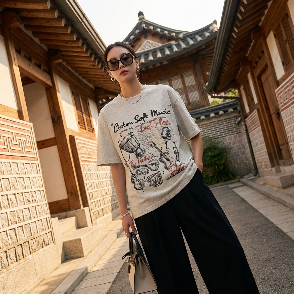 - Stile: Streetwear, K-fashion, Tendenza. Questa t-shirt incarna lo spirito casual e moderno della moda coreana, ideale per un look urbano e alla moda.