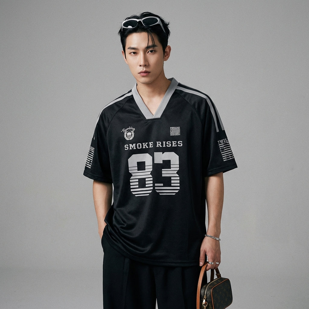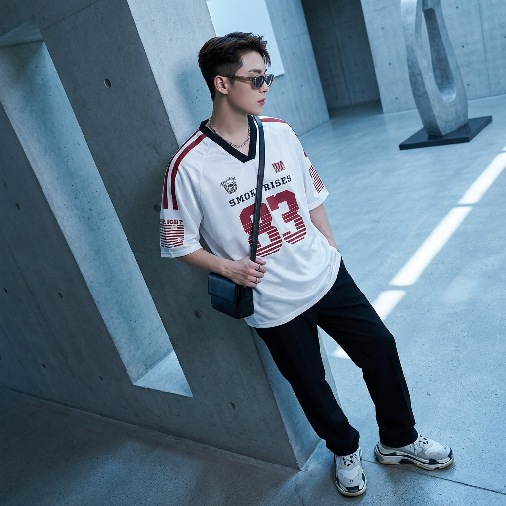 Adotta un look casual e alla moda con la nostra t-shirt con scollo a V e maniche corte, ideale per le giornate estive. Il suo design ampio e la stampa moderna la rendono un capo irrinunciabile per uno stile streetwear deciso! ✨