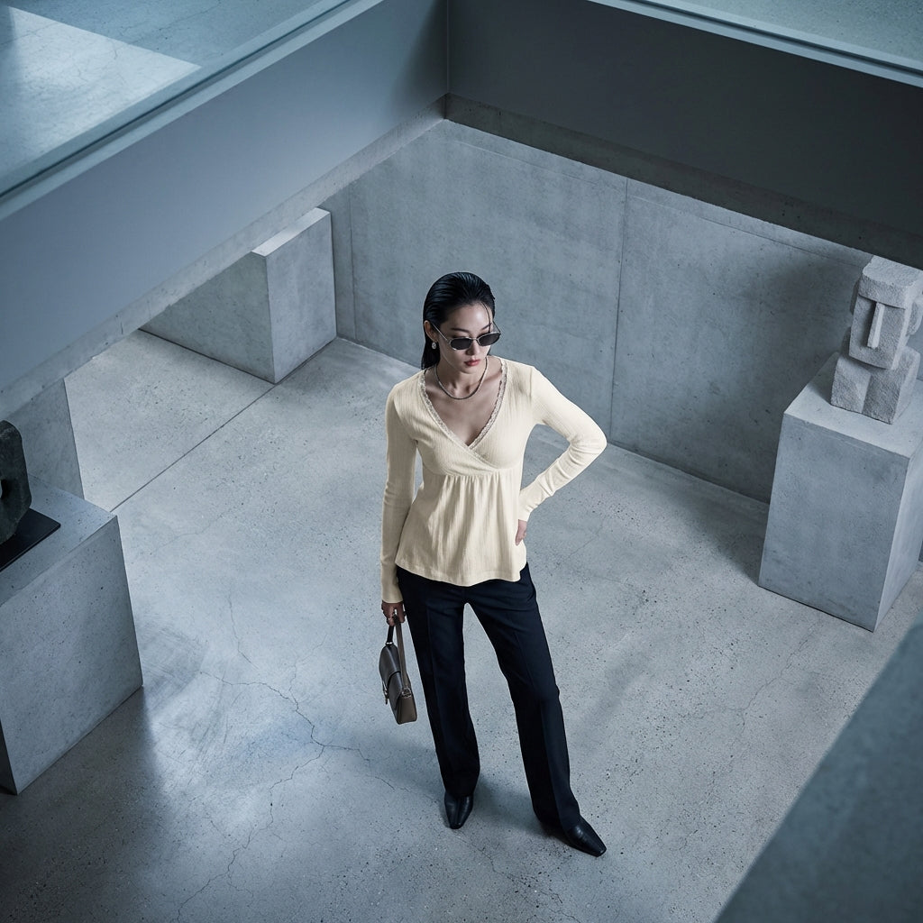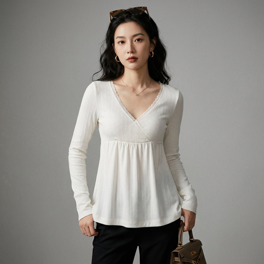 Adotta un look sofisticato con questa T-shirt a maniche lunghe, caratterizzata da un elegante scollo a V e delicati dettagli in pizzo. Ideale per un look chic e raffinato per tutti i giorni! ✨