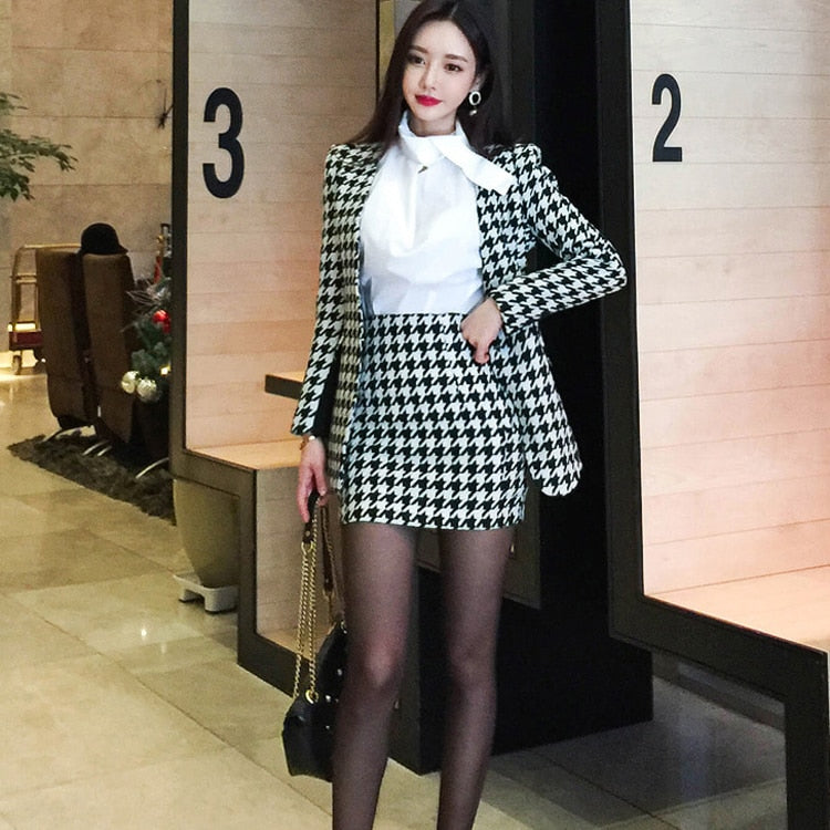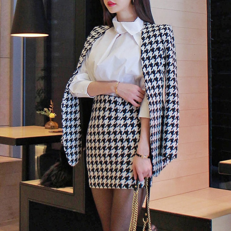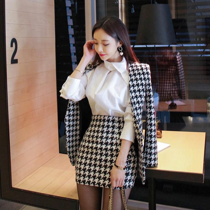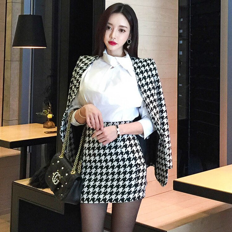 Indossa un tailleur coreano di classe! Questo tailleur giacca e gonna in bianco e nero è magnifico.