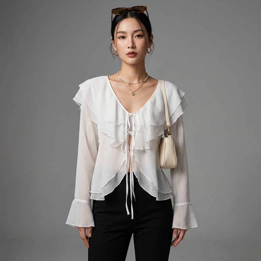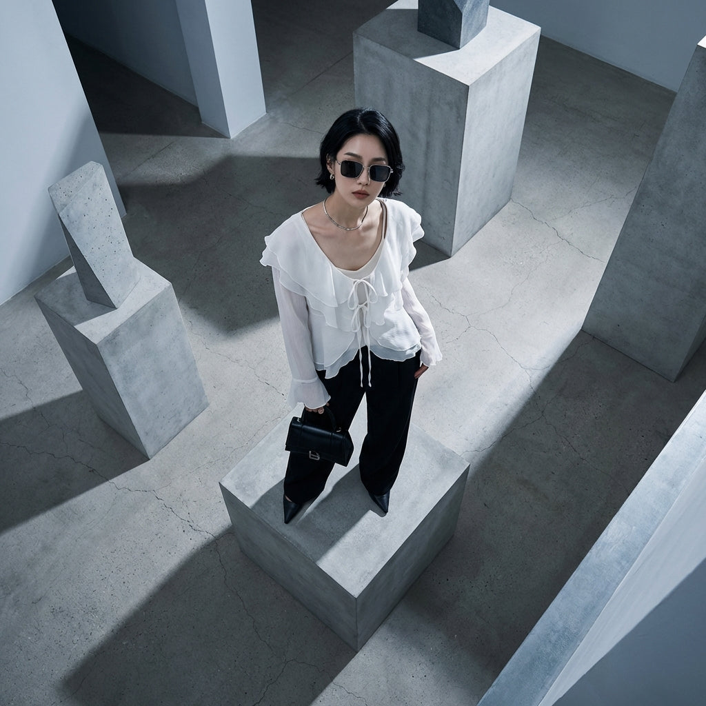 - Stile: K-fashion, Elegante, Di tendenza. Questo top riflette l'estetica moderna e chic della moda coreana, perfetto per diverse occasioni.