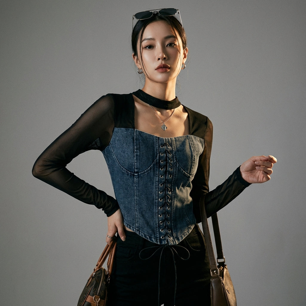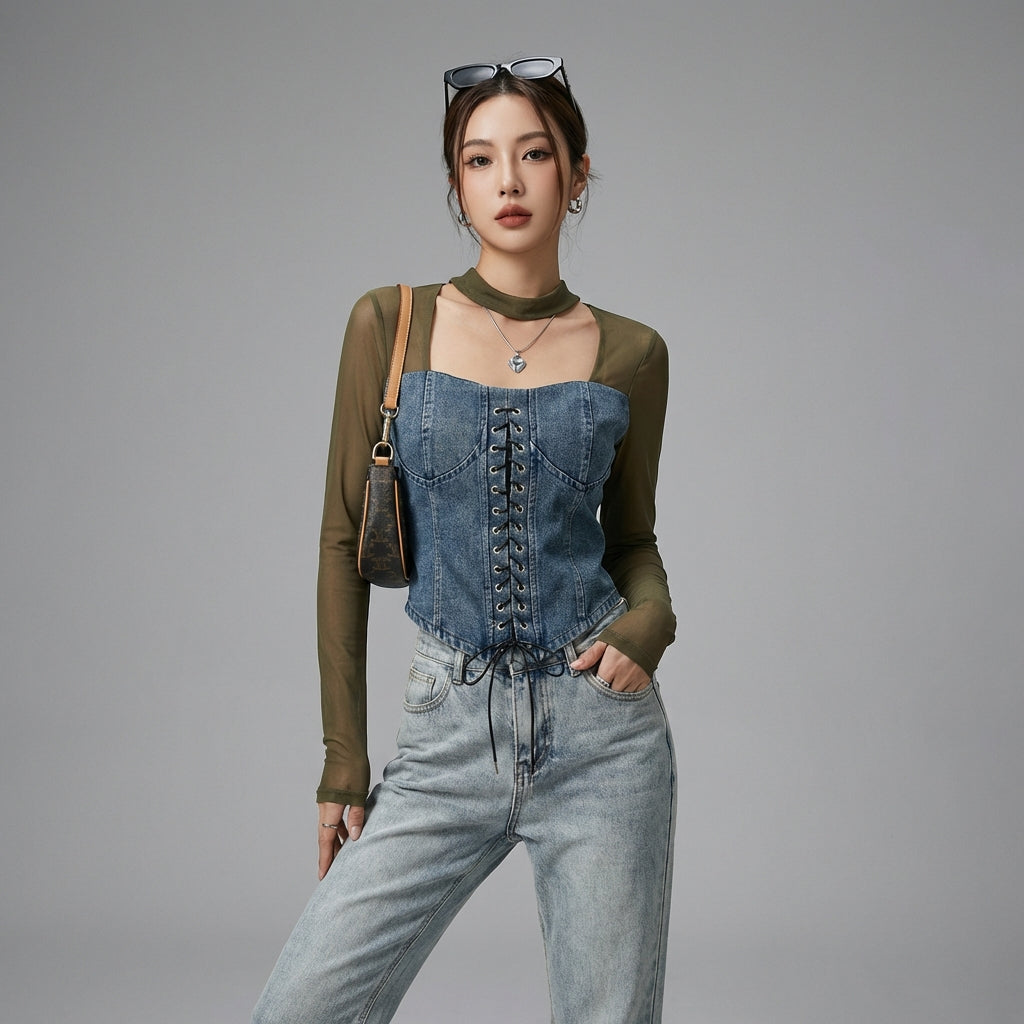 Afferma il tuo stile con questo audace crop top, che unisce l'eleganza del mesh trasparente e la modernità del denim. Il suo collo alto e le maniche lunghe irregolari creano una silhouette unica e di tendenza, perfetta per chi osa distinguersi! 💫