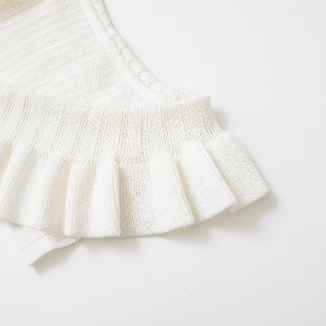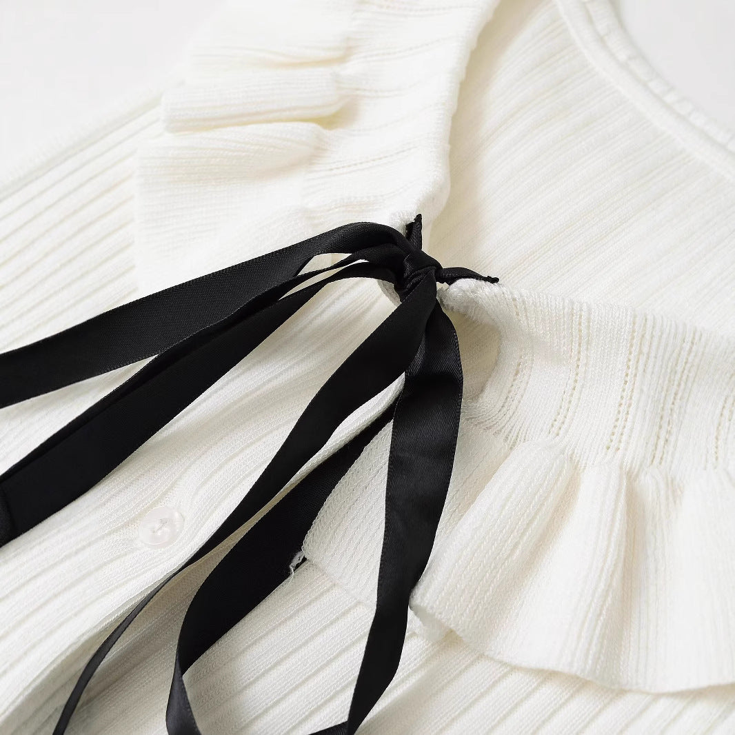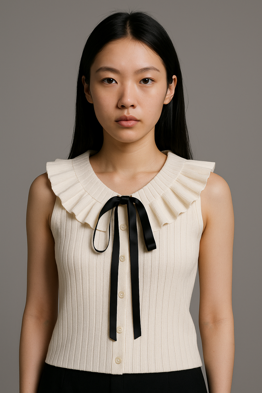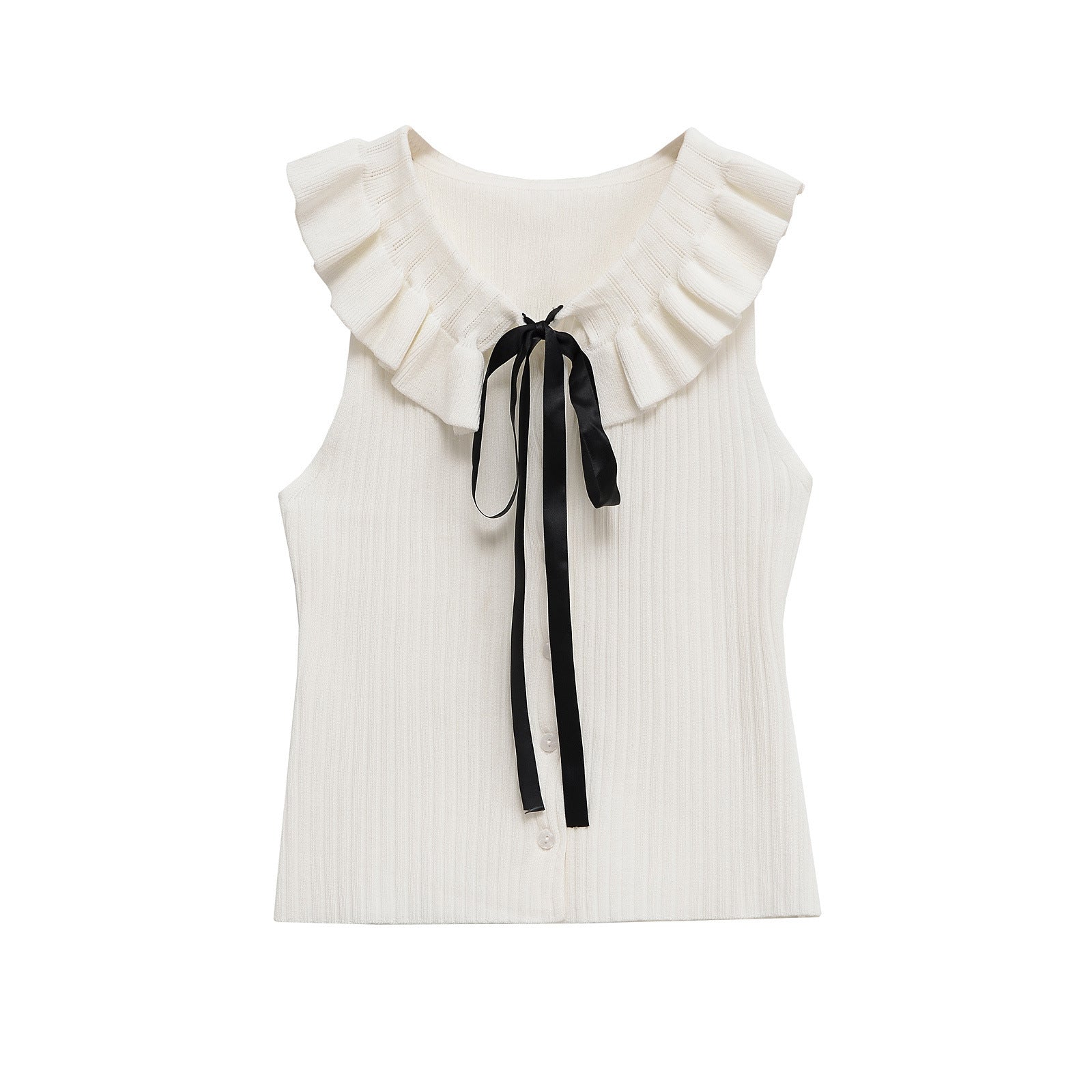 - Type : Top sans manches avec col en dentelle et nœud.