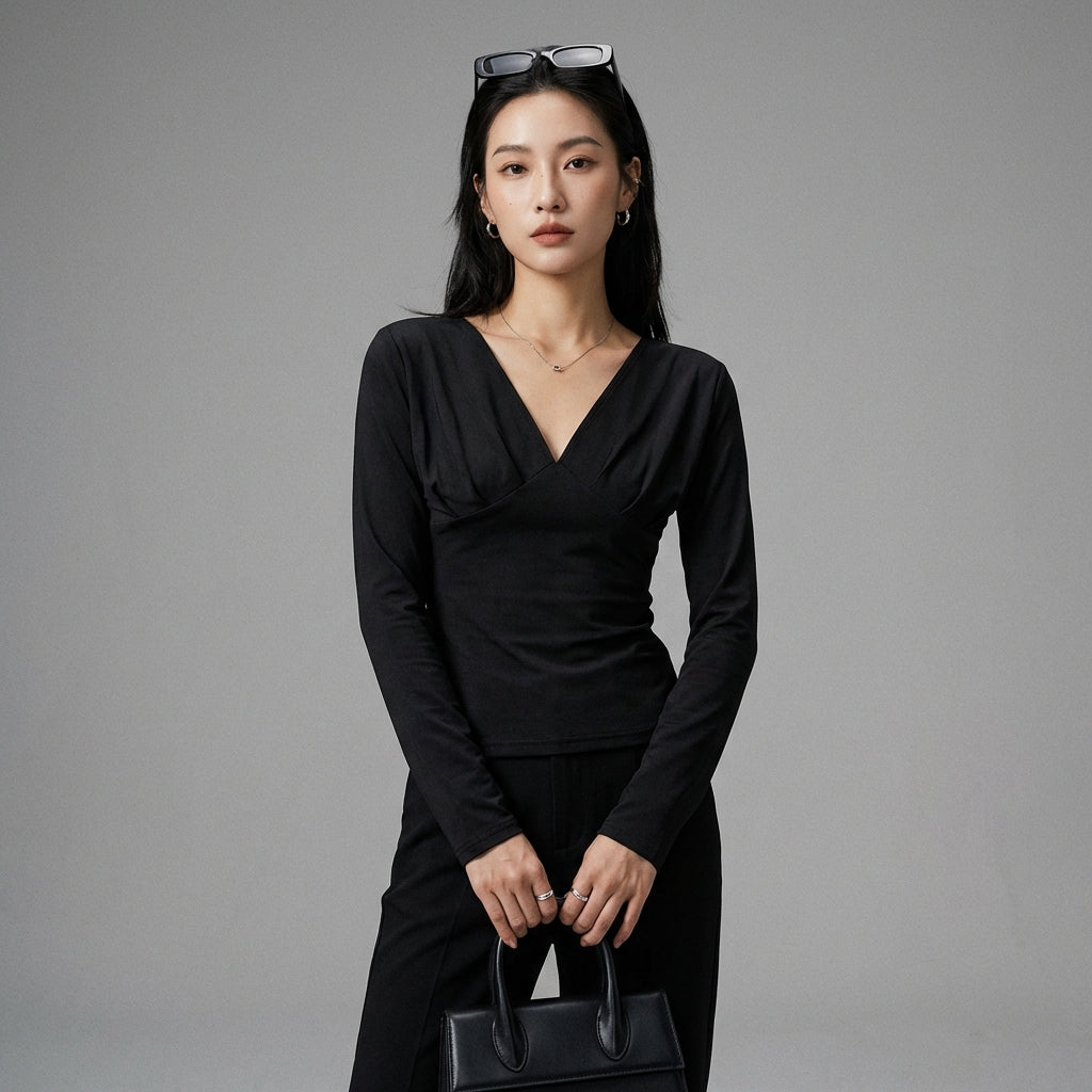 Scopri il nostro top plissettato a maniche lunghe e scollo a V, un capo essenziale per un look elegante e moderno. Il suo taglio aderente esalta la silhouette con raffinatezza! ✨