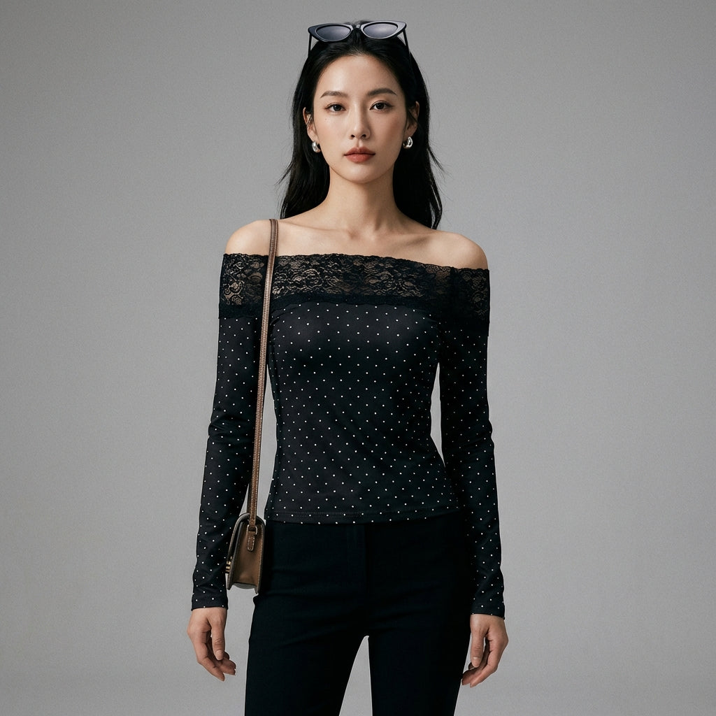 Adotta un look chic e alla moda con il nostro top con scollo a barca, delicatamente ornato di pizzo e una stampa a pois. Questo top a maniche lunghe è perfetto per aggiungere un tocco di discreta eleganza al tuo guardaroba! ✨