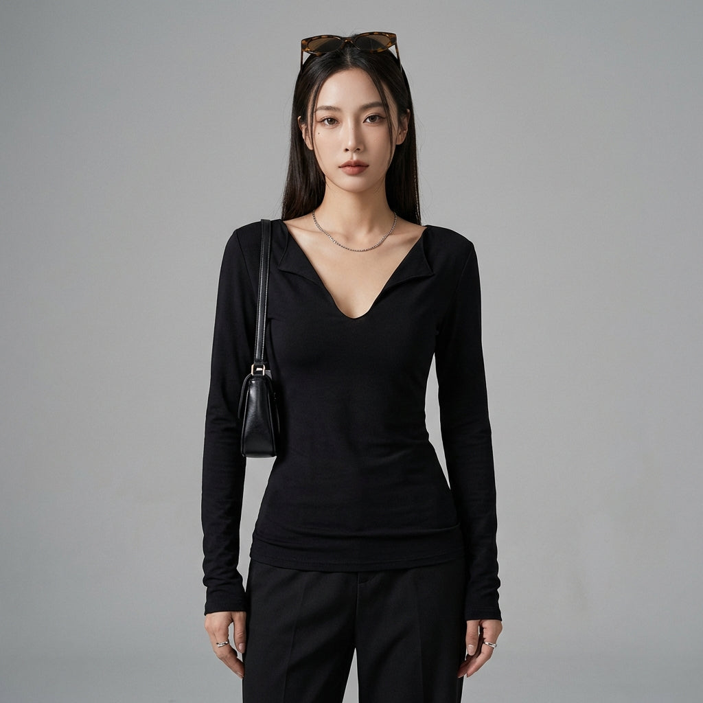Scopri il nostro top a maniche lunghe, perfetto per ogni occasione. Il suo scollo a V profondo e il taglio aderente esaltano la silhouette con un tocco di eleganza moderna. Un capo essenziale per un look chic e casual! ✨