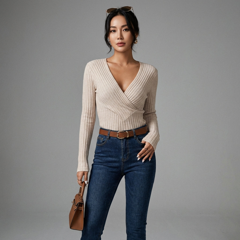 Scopri il nostro top a maniche lunghe, perfetto per una silhouette slanciata ed elegante. Il suo scollo a V lusinghiero e il taglio aderente esaltano la tua femminilità con sottigliezza. Ideale per tutte le occasioni, unisce comfort e raffinatezza! ✨