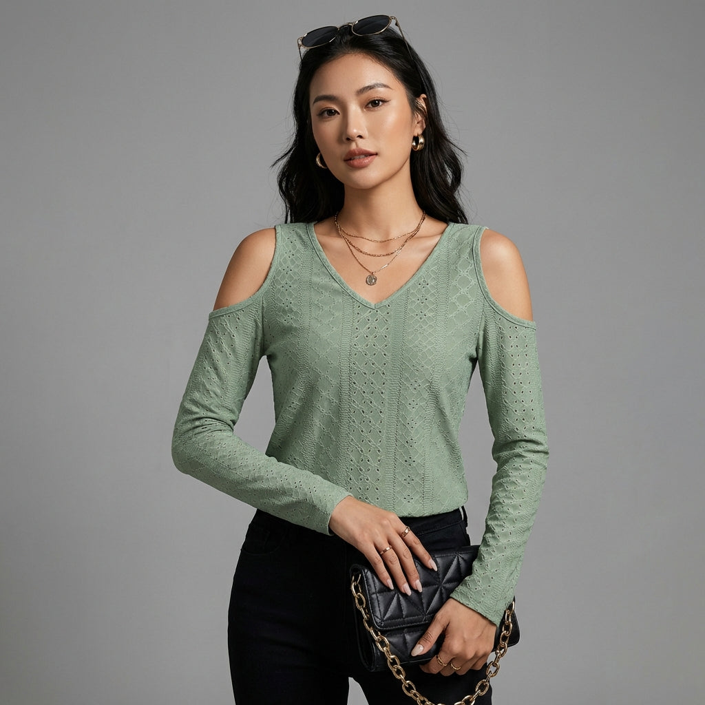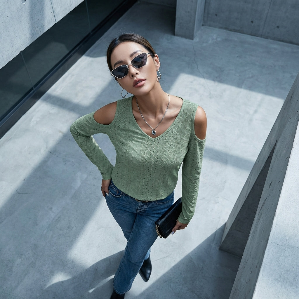 - Tipo: Top a maniche lunghe, Spalla scoperta, Scollo a V. Un design traforato che rivela sottilmente la pelle per un tocco di femminilità.