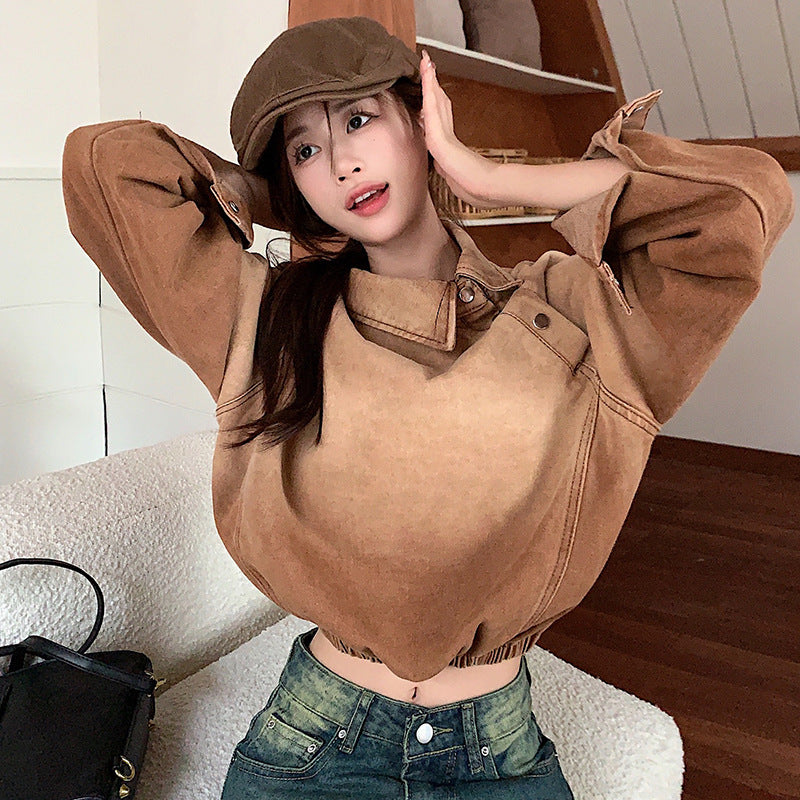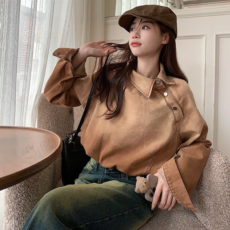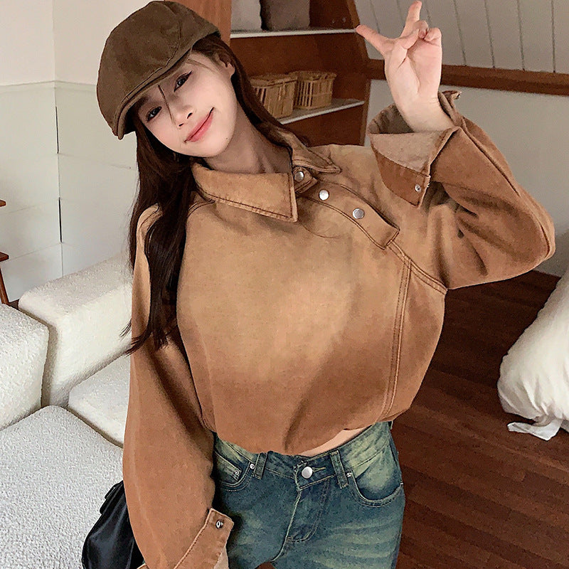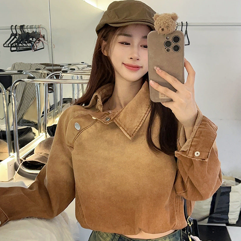 Adoptez un look rétro avec notre veste courte coréenne pour femme, idéale pour le printemps. Son design marron dégradé et son col diagonal ajoutent une touche unique à votre tenue. 🌸